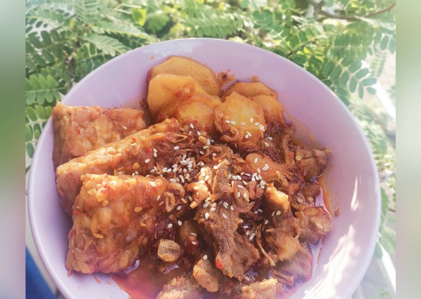 - Beri tambahan kentang dan tempe bila perlu. Biarkan air sampai menyusut agar bumbu meresap. Jangan lupa koreksi rasa dan sajikan.