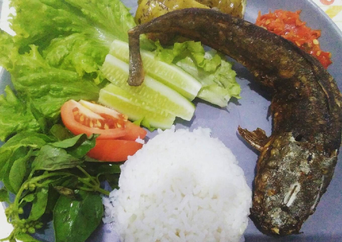 - Sajikan dengan lalapan timun, kemangi dan selada bokor