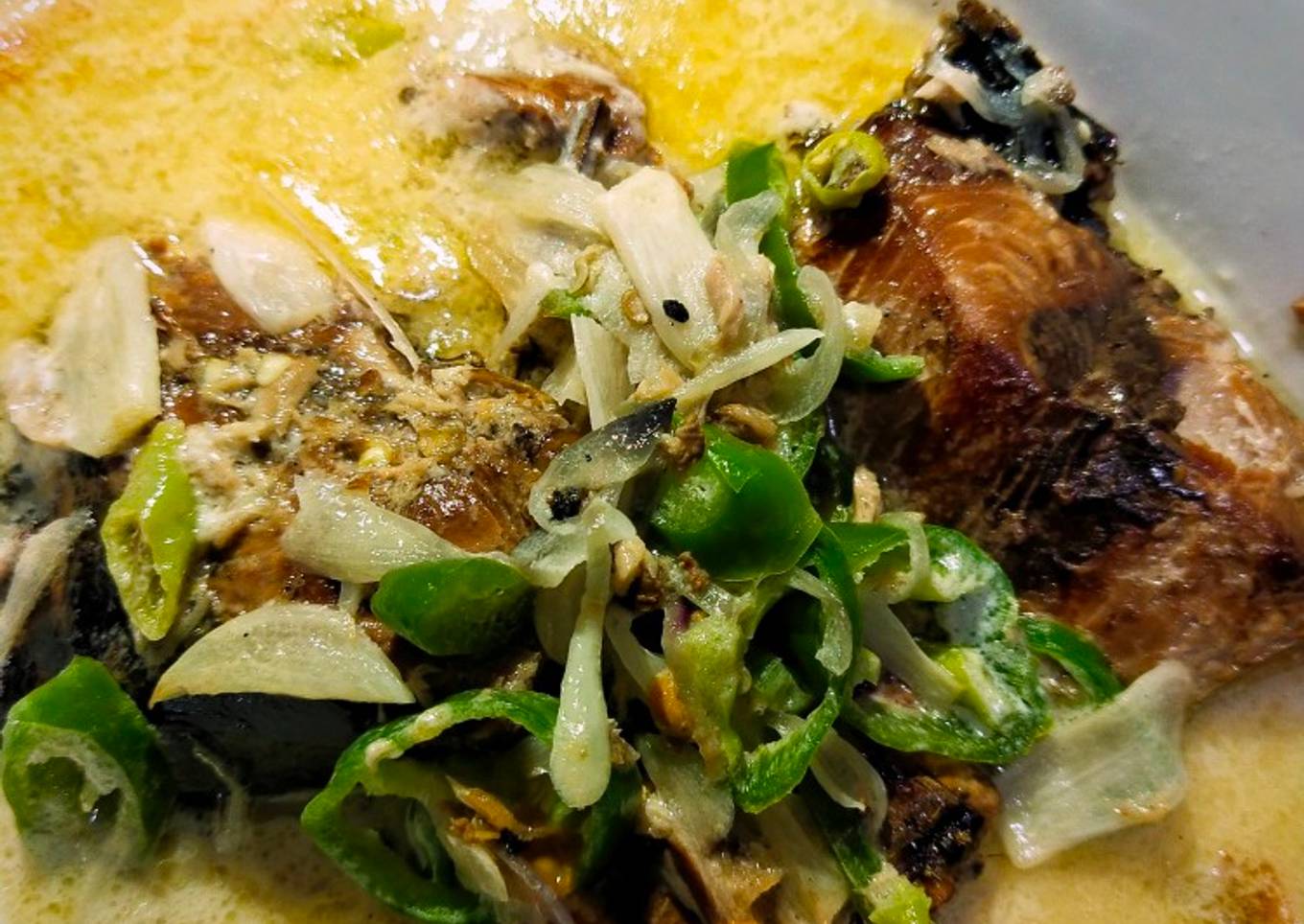 - Tumis bumbu iris dan bumbu cemplung, kecuali tomat dan cabe hijau. Tumis hingga aromanya harum, lalu masukkan potongan ikan asapnya. Masak sampai kira" kedua sisi potongan ikan agak kering.