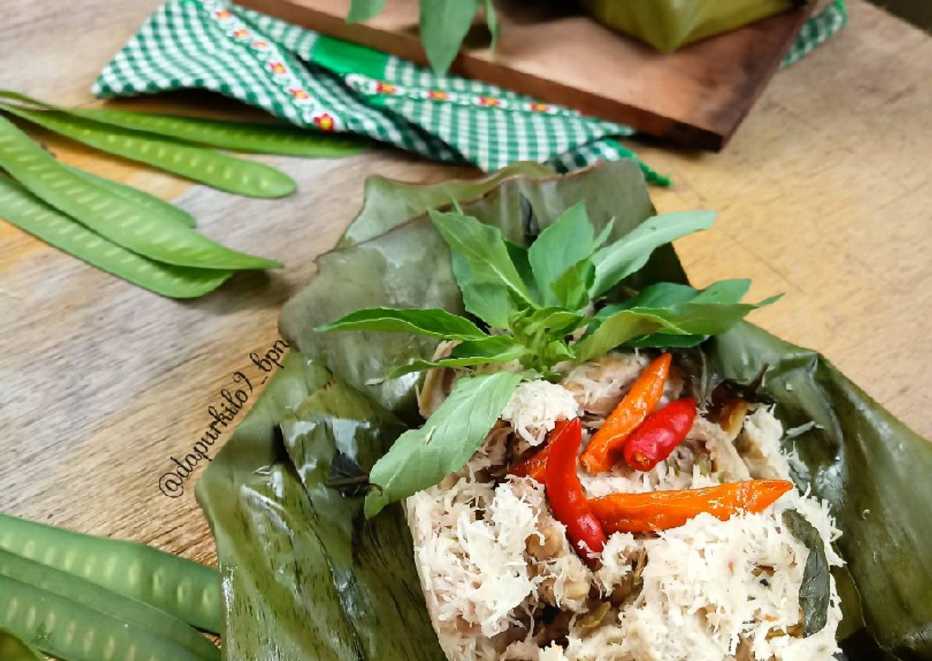- Siapkan daun,ambil 2sdm adonan tata diatasnya,toping dg cabe rawit & kemangi,kemudian bungkus daunnya & rapatkan dg lidi.