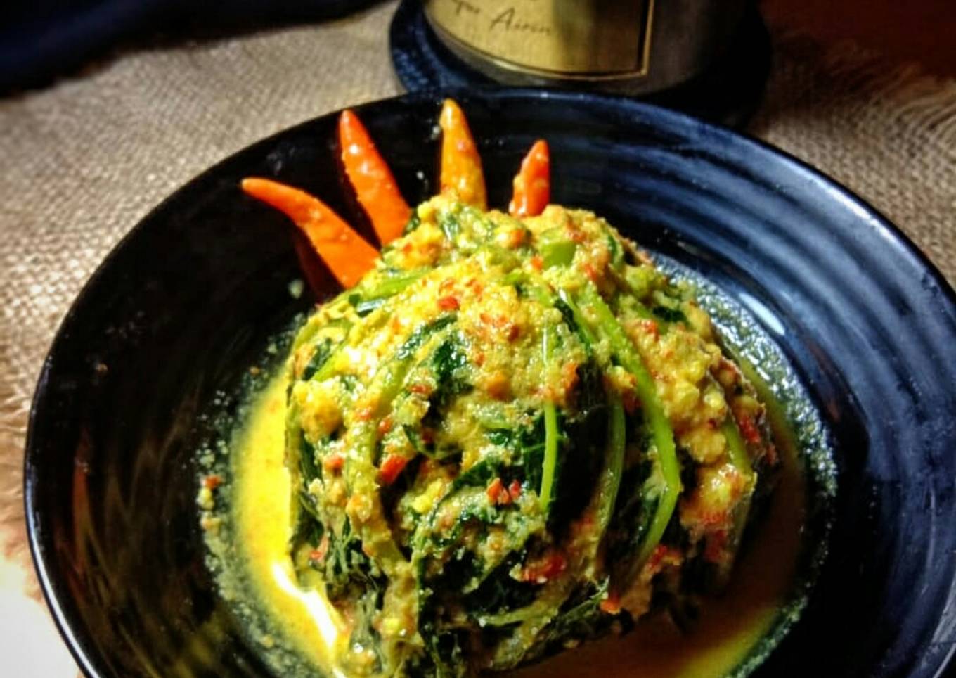 - Campur kelapa, garam, teri jengki dan bumbu yang sudah dihaluskan, lalu aduk rata. Lalu susun daun pepaya, tumpuk sekitar 4 sampai dengan 6 lembar daun pepaya.