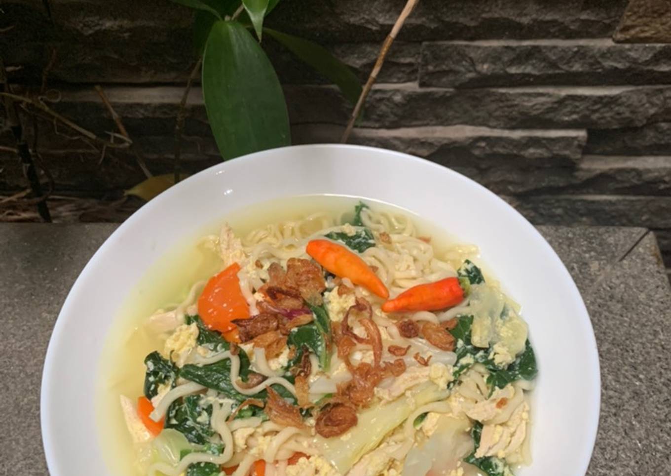 - Tambahkan ayam dan air kaldunya. Masukkan garam dan kaldu bubuk. Aduk merata dan koreksi rasa. Tunggu hingga sayuran layu. Setelah itu masukkan mie yg sudah direbus. Aduk merata. Setelah matang sajikan dengan taburan bawang goreng.
