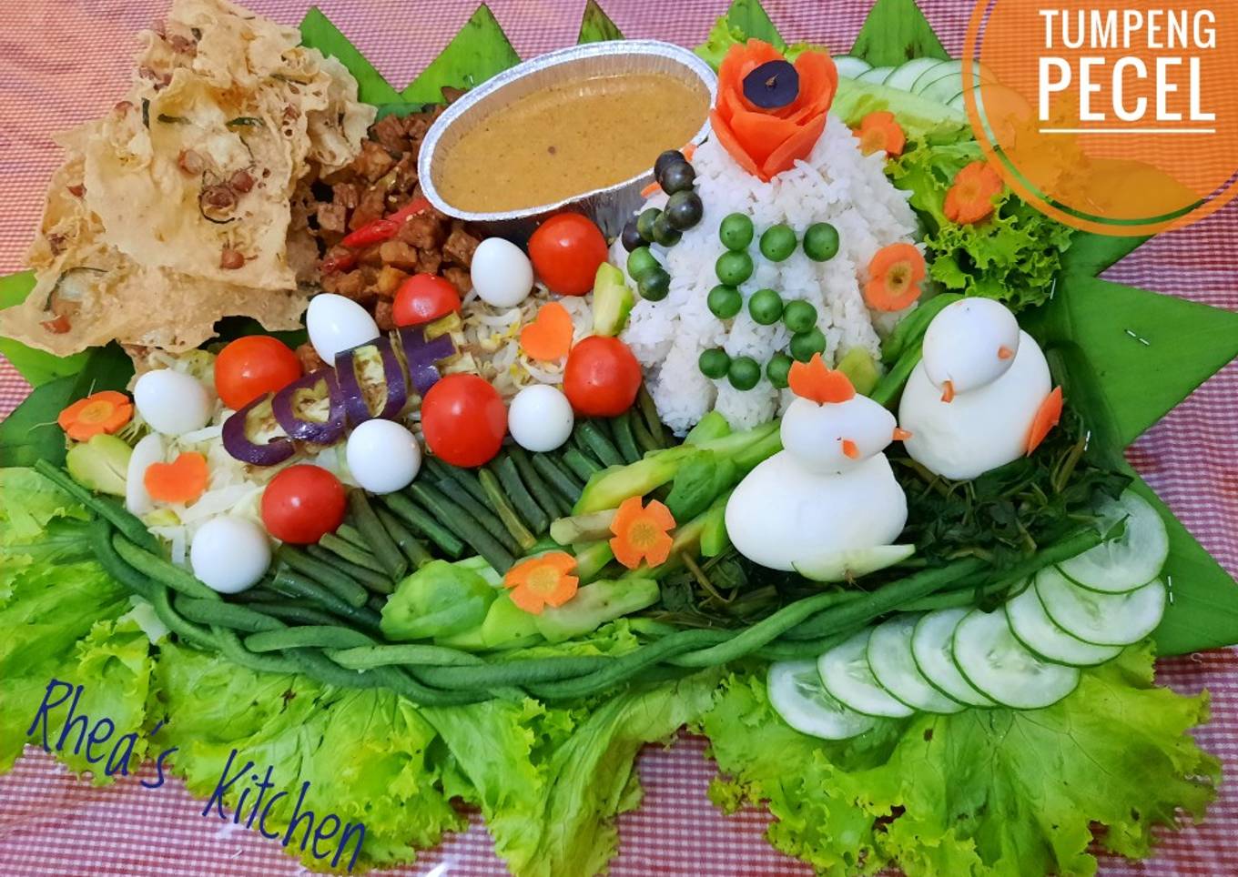 - Tata selada diatas daun pisang, lalu taruh bumbu pecel, sayuran, orek tempe dan peyek sesuai selera. Hias dengan telur ayam, telur puyuh dan garnish sesuai kreasi masing².