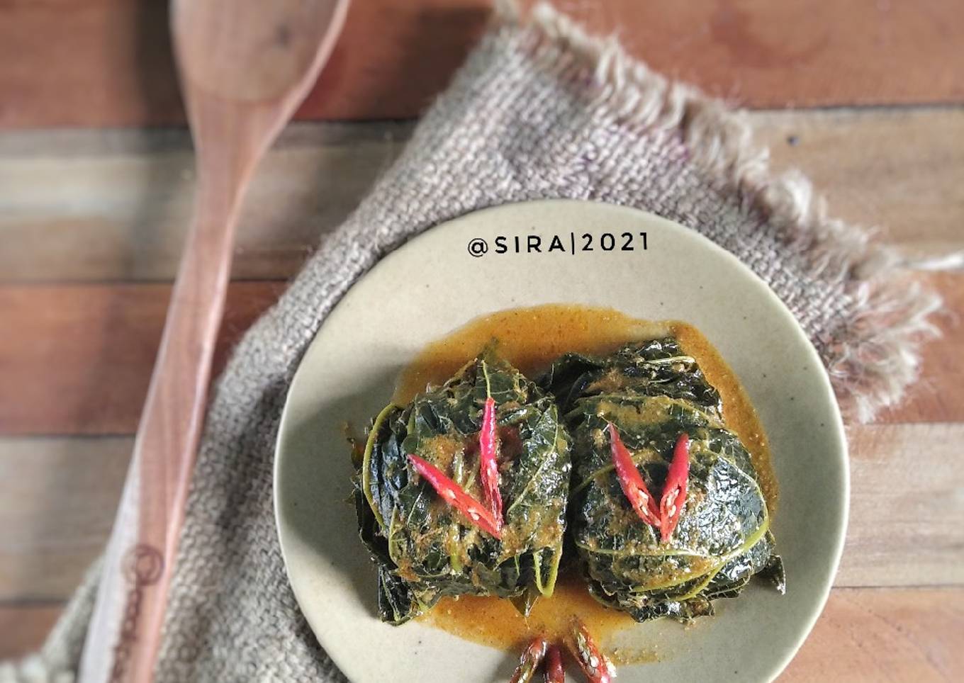 - Ambil 2 daun pepaya, tata berlawanan agar tidak bocor. Taruh isian di tengah. Kemudian gulung. Lakukan hingga selesai. Kukus selama 30 menit.