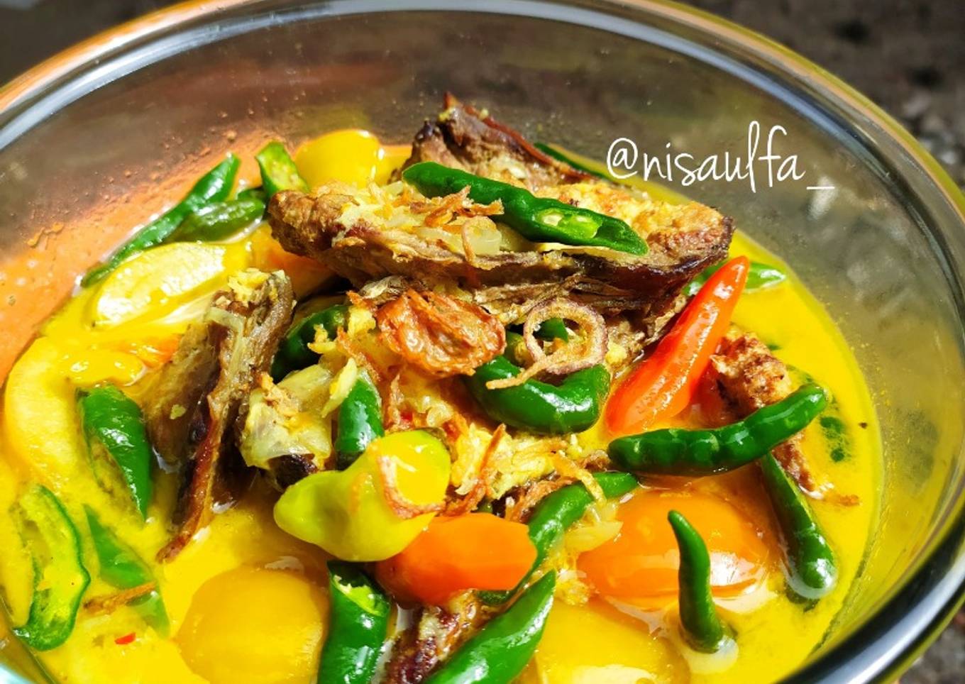 - Bumbui dengan garam, kaldu bubuk dan gula merah. Masukkan ikan asap, tunggu sampai mendidih. Sambil sesekali diaduk agar santan tidak pecah.