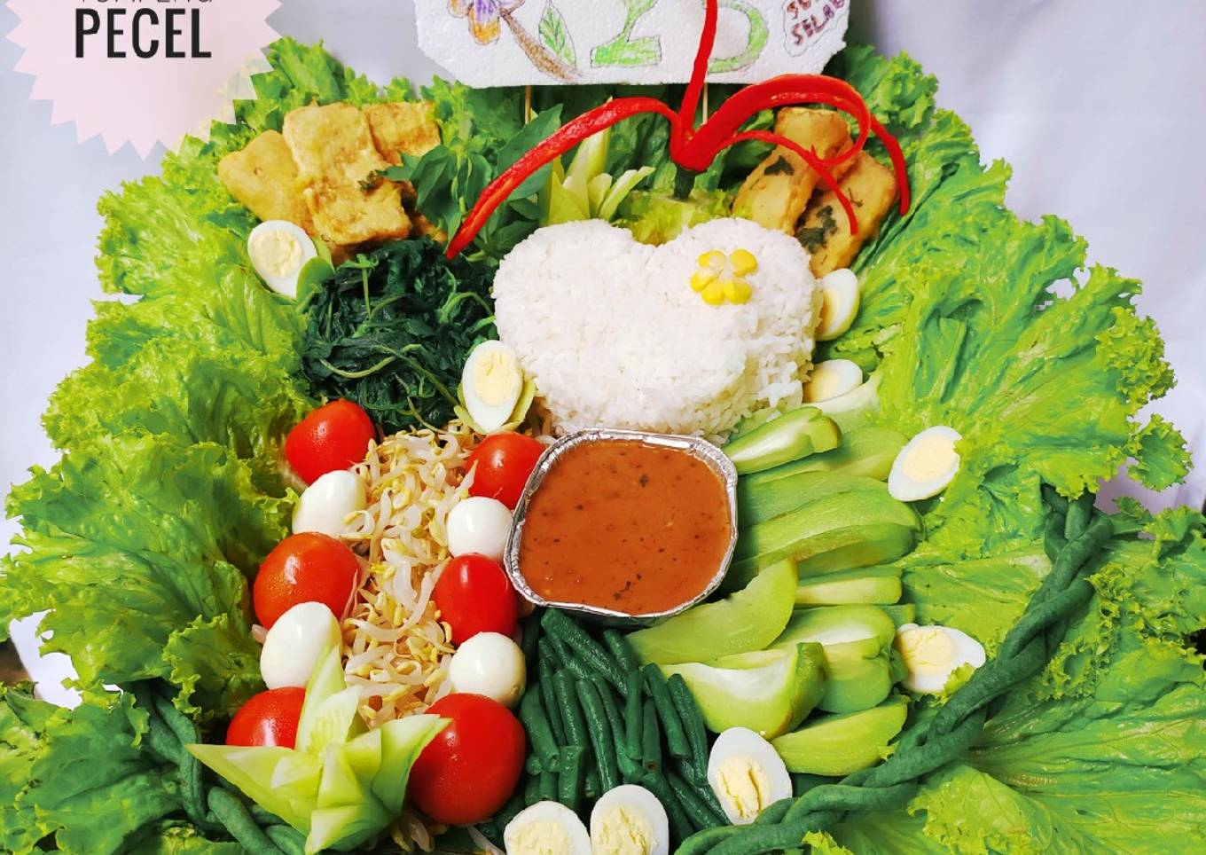- Tata bumbu pecel, nasi putih, sayur2an rebus dan juga tempe goreng. Hias sesuai kreasi masing- masing.