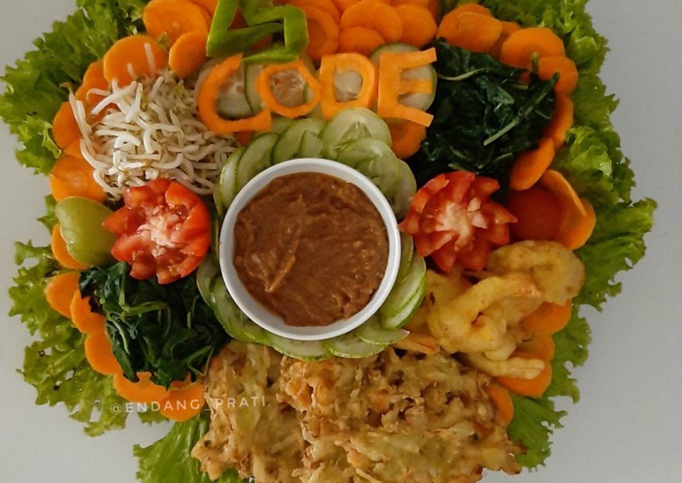 - Susun sayuran, gorengan dan bumbu pecel, hias sesuai selera