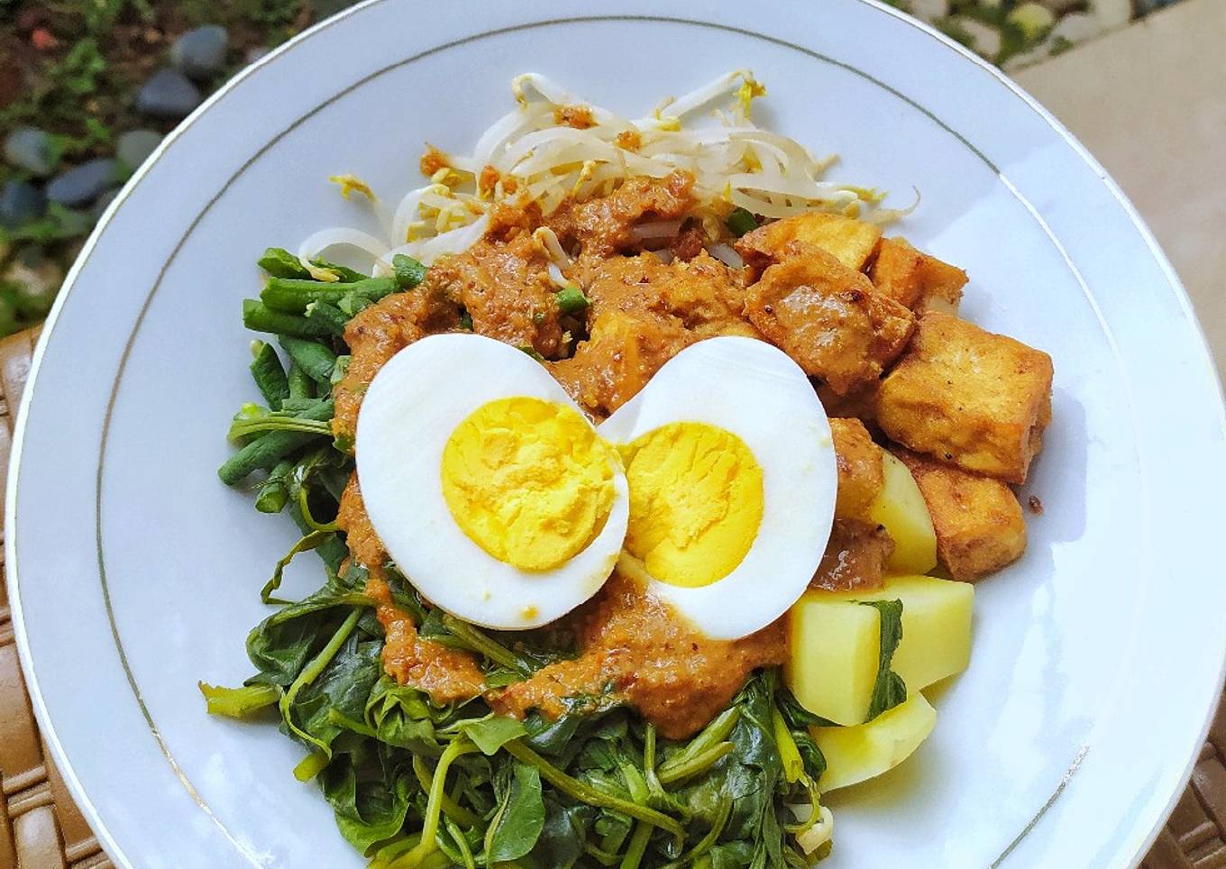 - Tata di piring semua sayuran (toge, kacang panjang, kangkung), kentang rebus, dan tahu goreng. Siram dgn bumbu pecel